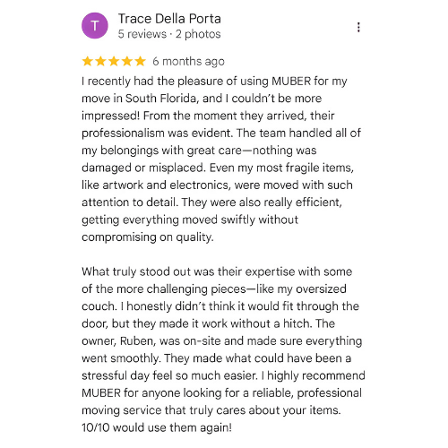 Muber has completed hundreds of successful moves across South Florida, from residential relocations in Aventura to commercial office moves in Hollywood. Check out our portfolio to see how we’ve helped clients move smoothly, no matter the size or complexity.